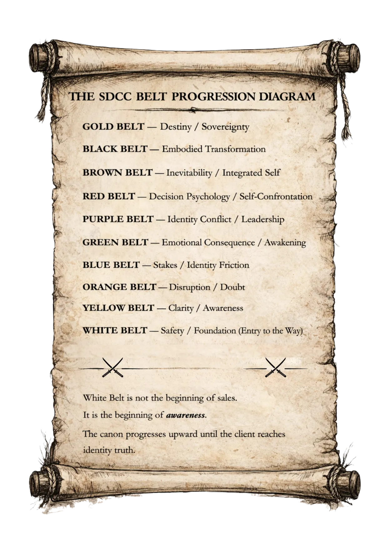 Our system allows new team members to go from sales novice to calm, ethical, and effective under pressure in weeks — not months or years — because they are trained through a belt-ranked framework where progress is observable, skills are explicit, and advancement is earned.